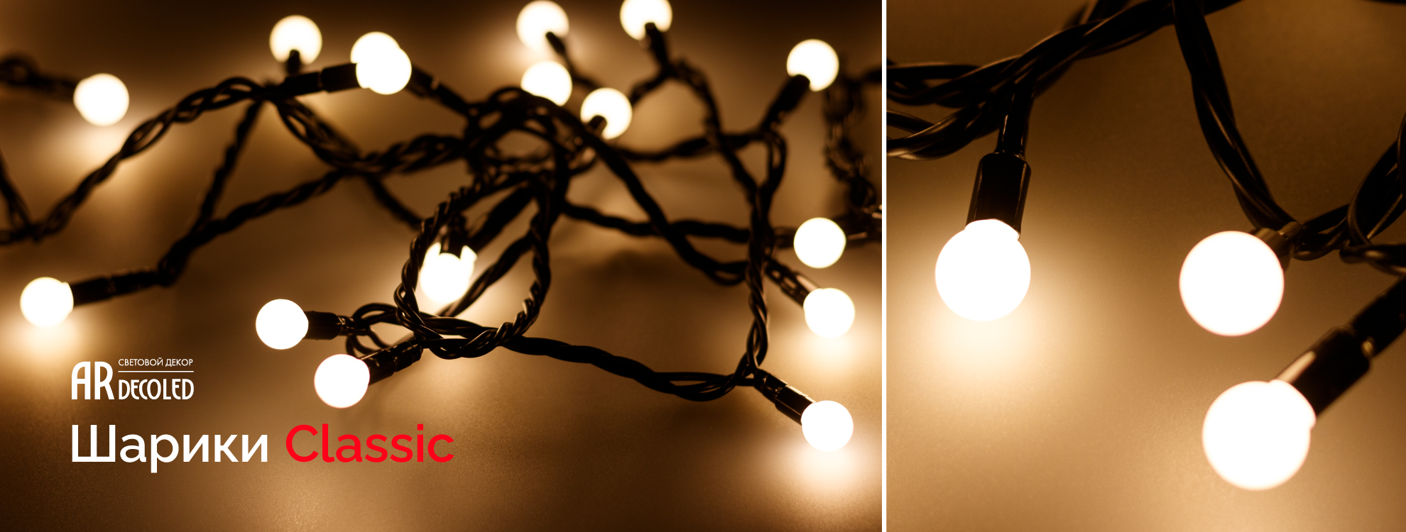 Широкий ассортимент В серии представлены гирлянды с шариками разных размеров — 13, 17.5 и 23 мм. Также вы найдете модели разных цветов свечения — от стандартных оттенков белого до атмосферного синего и разноцветного.