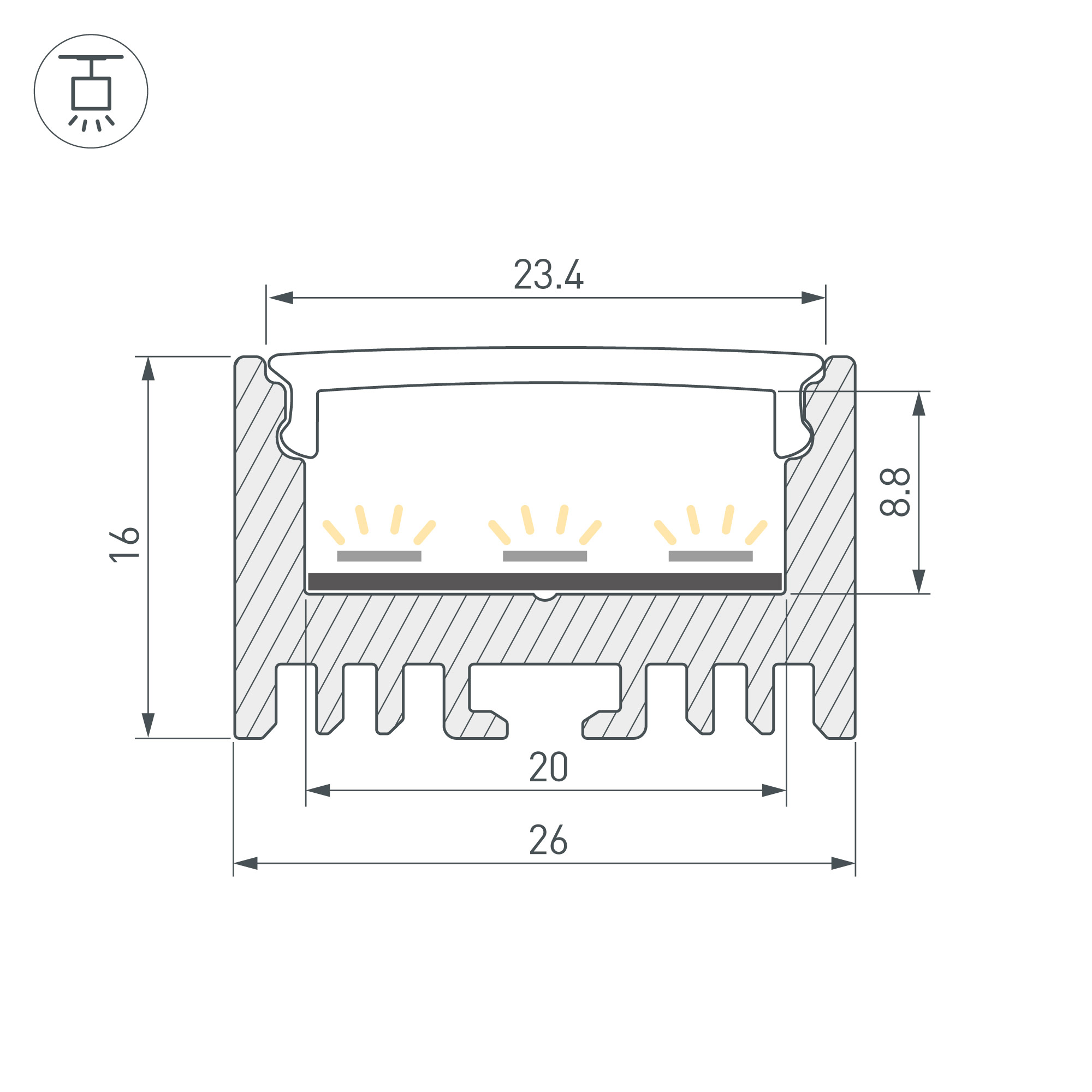Алюминиевый анодированный подвесной профиль для светодиодных лент и линеек. Габаритные размеры (L×W×H): 2000x26x16 мм. Ширина площадки для ленты 20 мм. Экраны, заглушки и другие аксессуары приобретаются отдельно. Цена за 1 метр.