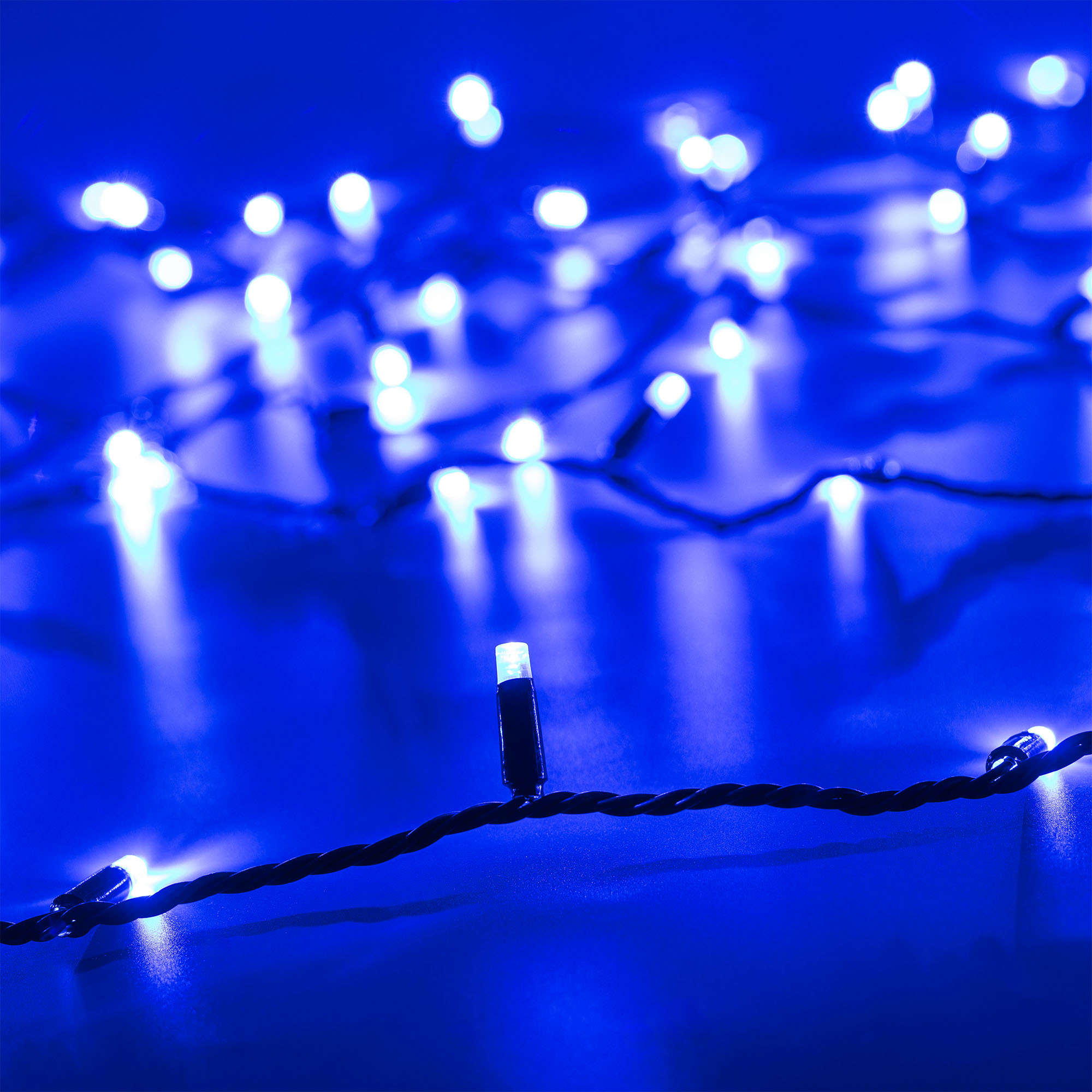 Светодиодная нить Classic. Размер 10000 мм. Цвет свечения СИНИЙ. 100 светодиодов размером 7 мм со статическим эффектом свечения с резким световым рисунком (прозрачная вогнутая линза). Провод черный, ПВХ. Питание 230 В, Мощность 7 Вт, защита IP65, применение в помещении и на улице под навесом. Аксессуар для подключения приобретается отдельно.