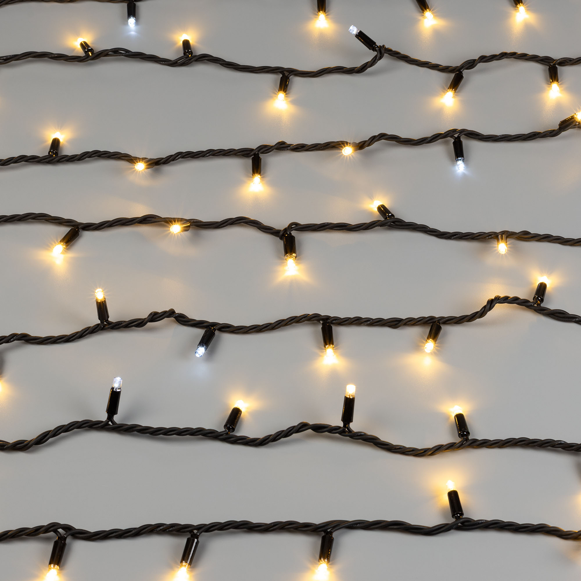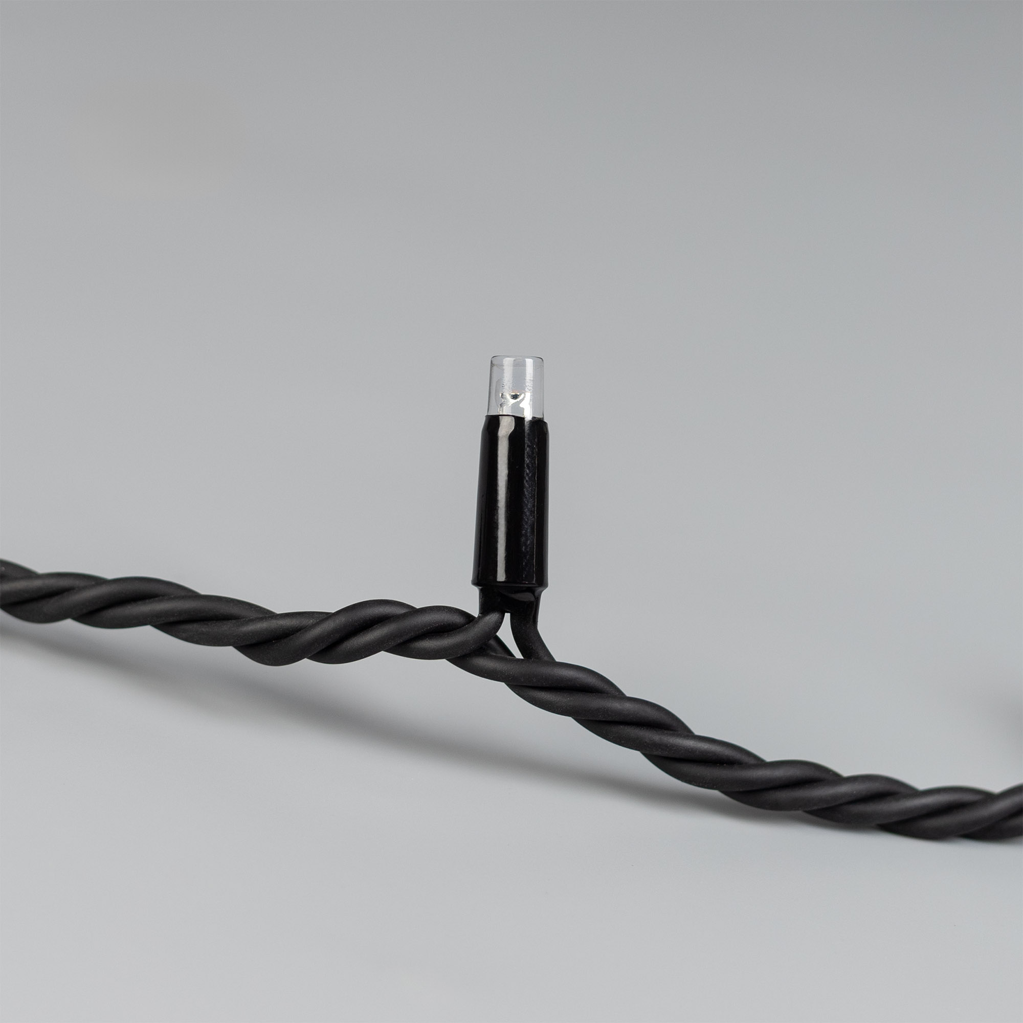 Светодиодная нить Pro. Размер 10000 мм. 100 светодиодов размером 7 мм. Основной цвет свечения ТЕПЛЫЙ БЕЛЫЙ (3000 К), эффект мерцания редких точек (БЕЛЫЙ 6000К) с резким световым рисунком (прозрачная вогнутая линза), соотношение светодиодов: 84 теплых постоянного свечения / 16 белых с мерцанием. Эффект частого мерцания. Провод черный, каучук. Питание 230 В, Мощность 7 Вт, защита IP65, применение в помещении и на улице под навесом. Аксессуары для подключения и управления приобретаются отдельно.