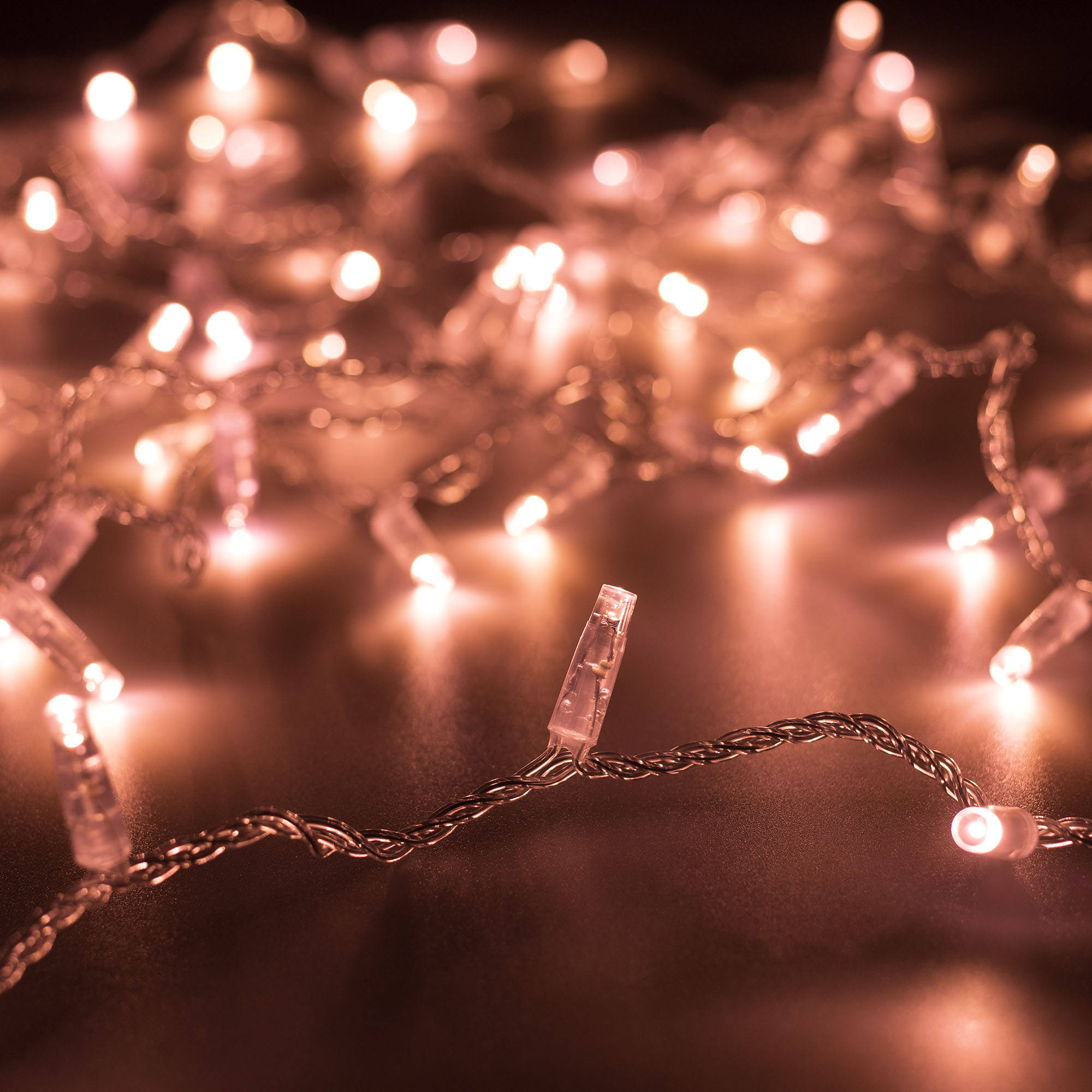 Светодиодная нить Classic. Размер 10000 мм. Цвет свечения РОЗОВОЕ ЗОЛОТО. 100 светодиодов размером 7 мм с эффектом медленного мерцания каждого светодиода с резким световым рисунком (прозрачная вогнутая линза). Провод прозрачный, ПВХ. Питание 230 В, Мощность 7 Вт, защита IP65, применение в помещении и на улице под навесом. Аксессуары для подключения и управления приобретаются отдельно.