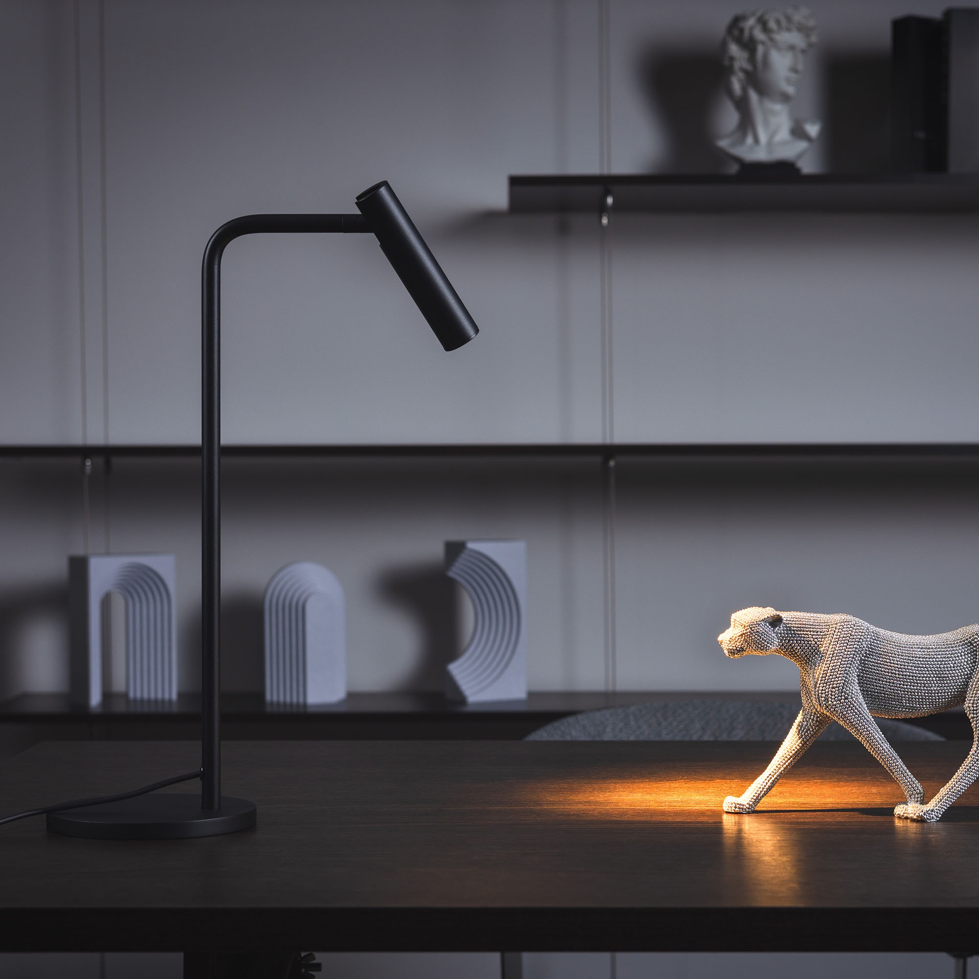 Декоративный настольный светильник. Мощность 3 Вт, св. поток 180 лм, 60 лм/Вт, теплый 3000К, CRI>90, угол 20°, напряжение питания 230 В. Черный корпус из алюминия (основание, ножка, светоизлучаль в форме спота), степень защиты IP20. Размер основания Ø140×11 мм, размер ножки Ø12.7×400х105 мм, размер светоизлучателя Ø28×120 мм. Длина провода 1510 мм, питание от сети 220-240V., пульсация <2%