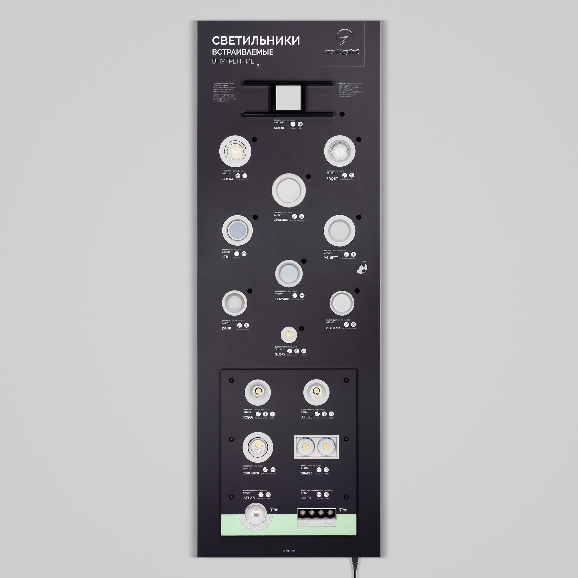 На стенде представлены самые ходовые модели даунлайтов серий FROST, CYCLONE, BREEZE, POLAR, DROP, LTD, BLIZZARD, MIST, EXPLORER, SIMPLE, ATLAS TRIMLESS, ORIENT BUILT TRIMLESS, GRIGLIATO, GLORY, FOGGY, ATOLL.