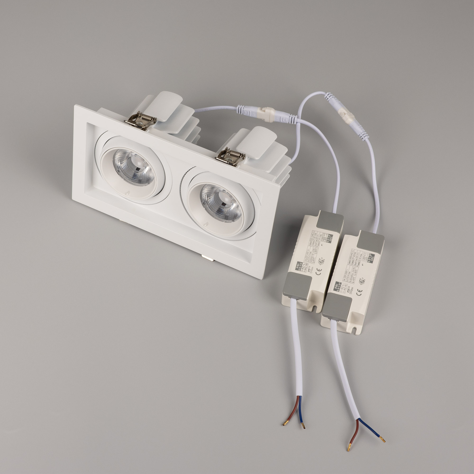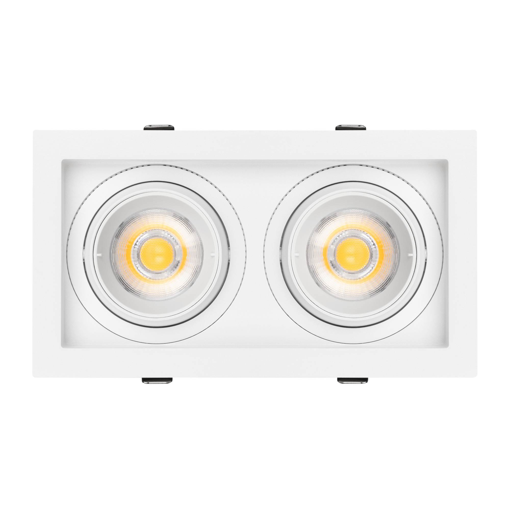 Встраиваемый карданный светильник. Мощность 2х20 Вт, св. поток 4264 лм, 106 лм/Вт, дневной 4000 K, CRI>92, угол 40°, напряжение питания 230 В. Белый корпус из алюминия, черная вставка, степень защиты IP20. Размер: длина 210 мм, ширина 117 мм, высота 105 мм. Монтаж встраиваемый, установочное отверстие: длина 190 мм, ширина 95 мм. Драйвер 24-42 В, 500 мА, пульсация <2%.