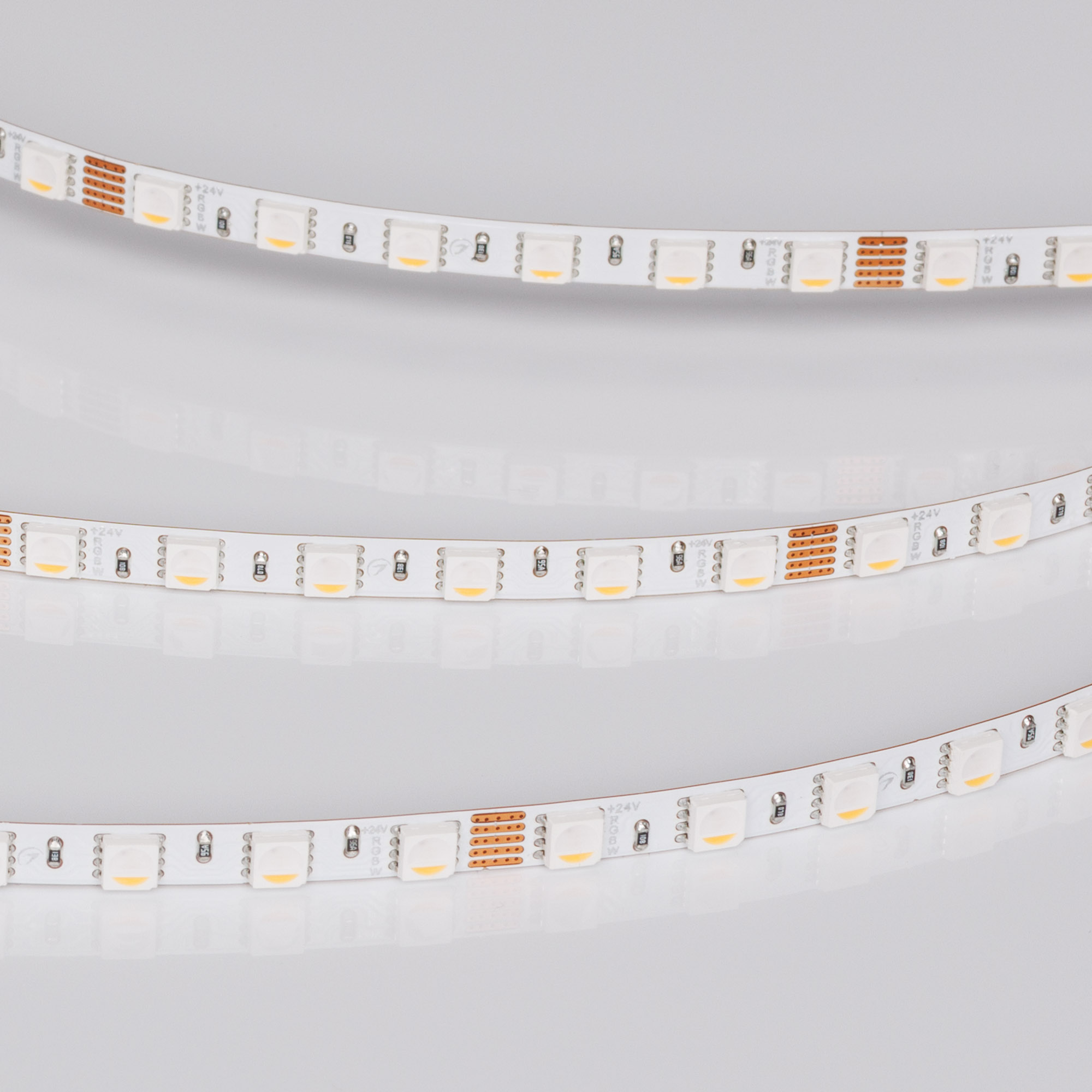 Светодиодная узкая лента RT серии H96. Светодиоды SMD 4040, 96 шт/м, белая плата, ширина 5 мм, скотч 3M. Цвет RGB + БЕЛЫЙ 6000K, индекс цветопередачи CRI>90, угол 120°. Питание 24 В, мощность 10 Вт/м (50 Вт на 5 м). Размеры 5000x5x2 мм, мин. отрезок 62.5 мм, 6 светодиодов. Цена за 1 м. Обязательна установка на профиль.