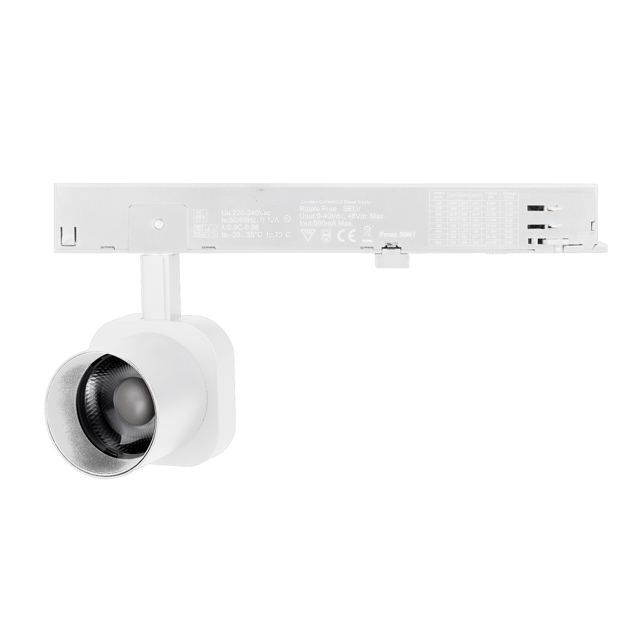 Светильник для треков/шин 4 провода. Мощность 10 Вт, св. поток 650 лм, 65 лм/Вт, дневной 4000 K, CRI>95, угол 20°, напряжение питания 230 В. Решетка HONEYCOMB в комплекте. Белый квадратный корпус из алюминия, материал линзы PC поликарбонат, степень защиты IP20. Размер световой части 60х60х62 мм. Монтаж на трек 3-фазный. Драйвер встроенный 9-40 В, 250мА., пульсация <1%