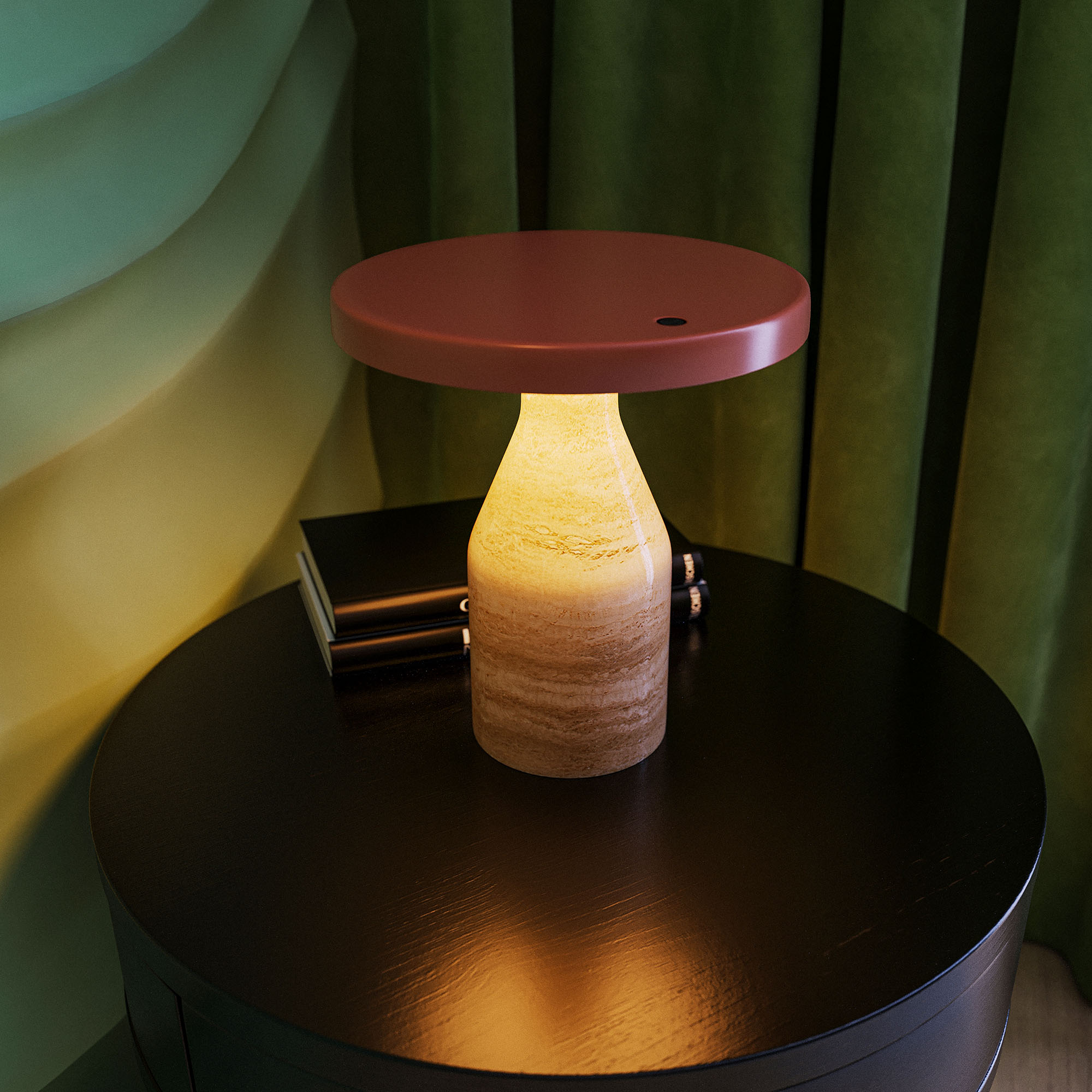 Настольный светильник CROOD. С изменяемой цветовой температурой 2700/3200/4000K, переключается коротким нажатием на сенсорную кнопку на плафоне, диммирование происходит за счет ее удержания. Мощность 7 Вт, св. поток 159 лм, 23 лм/Вт, теплый 3000 K, CRI>94, угол 140°, напряжение питания 230 В. Красный плафон из алюминия, основание из травертина, степень защиты IP20. Общая высота 240 мм. Габариты светового модуля DхH: 225 x 22 мм. Габариты основания DхH:: 100 x 220 мм. Пульсация <1%.