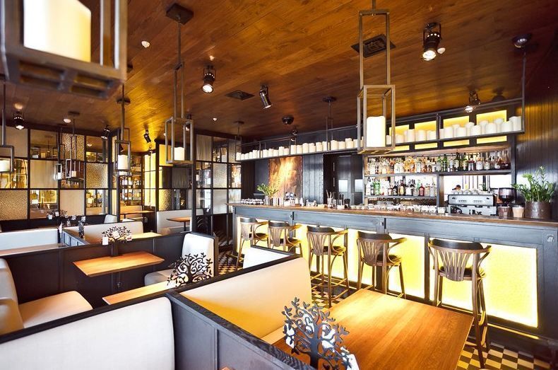 Декоративная и акцентная подсветка бара-ресторана "Solnce" («Солнце») на проспекте Добролюбова в Санкт-Петербурге. В подсветке интерьера использовалось светодиодное оборудование торговой марки